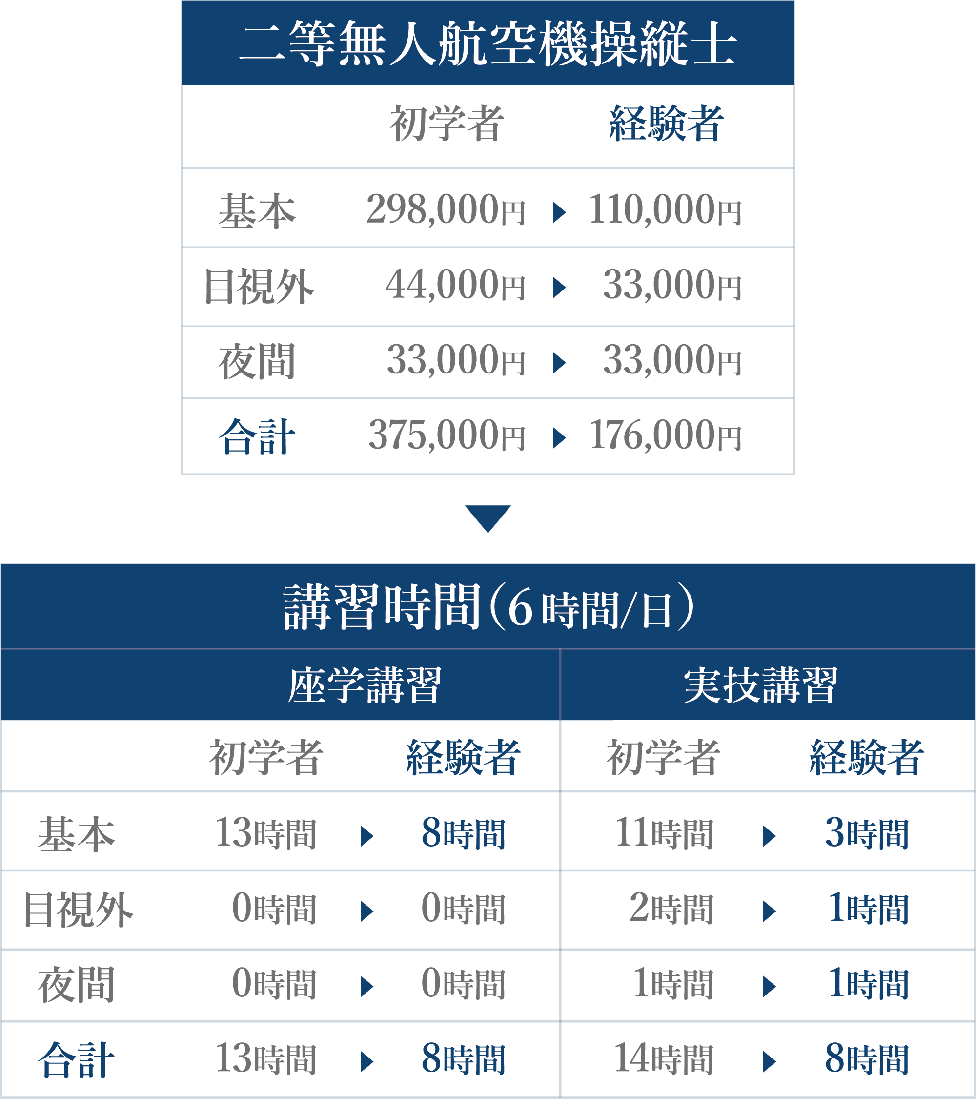 ※初学者の方と限定解除(目視外、夜間)についてはお問い合わせください。